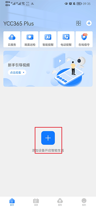 一、打开ycc365plus摄像头app,在首页中点击添加设备