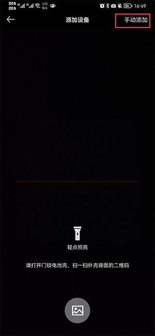 二、打开门锁电池壳,扫描外壳背面的二维码就可以绑定设备了,若扫描不了,可以点击右上角手动添加设备
