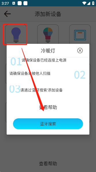设备页面点击“添加设备“->选择 “冷暖灯”->点击"蓝牙搜索",开始添加设备,添加完成后,对扫描到的设备进行分组。注意:要安装的设备正常上电,并处于出厂状态,如需要复位,请查看。