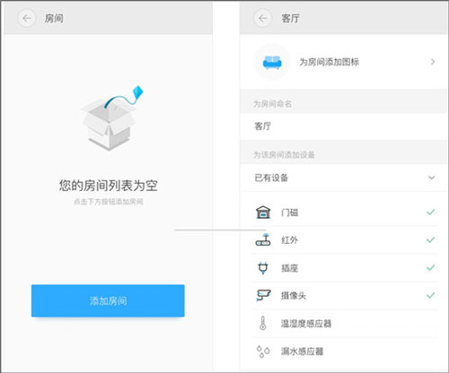 打开小翼管家客户端页面,按照房间分组显示设备列表,默认显示“全部” 分组。点击房间名称或在房间列表左右滑动,可切换当前房间。1、添加房间:若还没有添加房间,可点击左侧的“按钮添加房间,为房间添加图标和命名,以及为该房间添加设备。