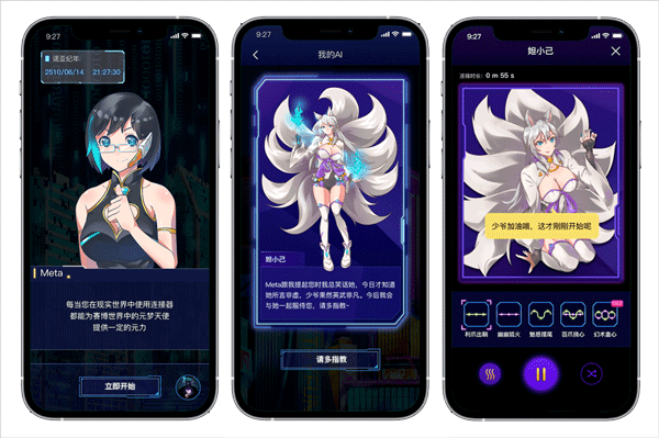 进入应用,映入眼帘的是一个充满赛博朋克风的开屏界面,其中双性别选项,可满足更多用户使用,倘若想体验App全部功能,则需要连接设备。而且目前在网易春风元力fun APP的主界面中除了个人信息显示外,能看到的还有“漫游指南”、“我的AI”和“春风情报局”,其中漫游指南展示了当前世界观的时间线以及背景;我的AI则包含三个虚拟角色,分别是兽耳狐仙妲小己、琴瑟仙女钰环以及都市少女遥遥,这三个角色都有独特的立绘,搭配上不同的背景故事,打造出风格各异的人设。此外,元力fun app更加详细的功能体验,需用户连接相应的设备才能生效哦~