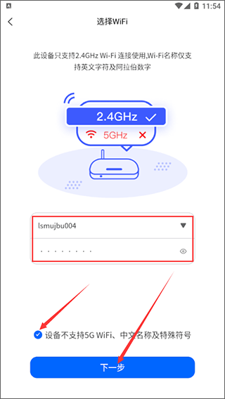 2、然后选择设备连接的WiFi,并输入正确的密码,点击下一步;