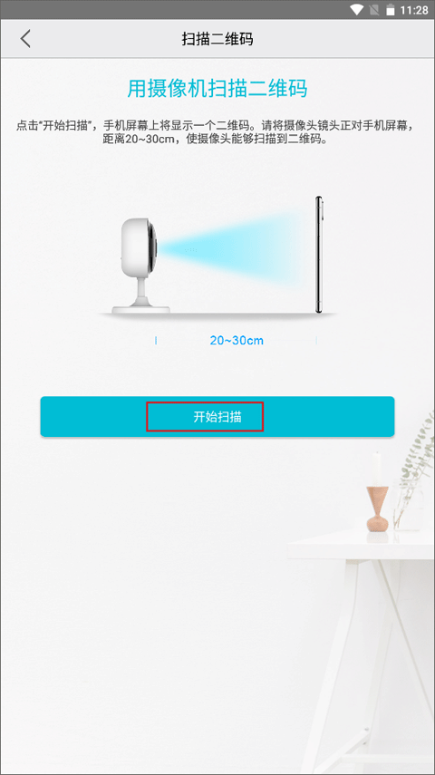 5、输入家中WiFi的密码并进入下一步,点击下方的“开始扫描”,这时手机屏幕上就会显示一个二维码,将摄像头对准手机屏幕一定距离,扫描成功后就可以添加成功了。