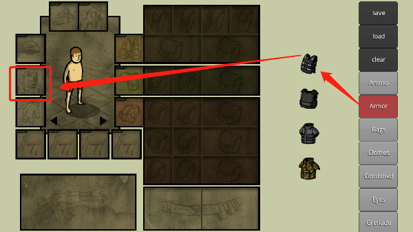 例:bag为书包和军用背包,eye为夜视仪和战术护目镜。用手拖动至人物四周对应的方框内,如果对应方框错误则无法保留所选物品。注:暗色部分需放置背包等物品解锁贮存空间