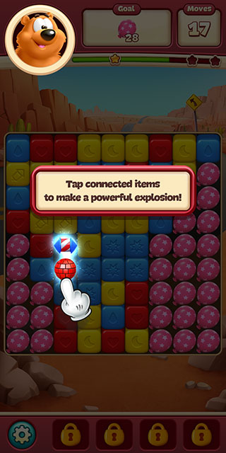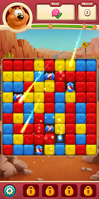 游戏还有全新的剧情冒险,跟着库柏猫、沃利狼和布鲁诺熊一起闯关,目标就是把颜色相同的方块连在一起消除掉。如果连续消出会生成特殊道具,点击这些道具还能触发更多效果哦!完成关卡还能解锁新角色和剧情,玩起来完全停不下来。