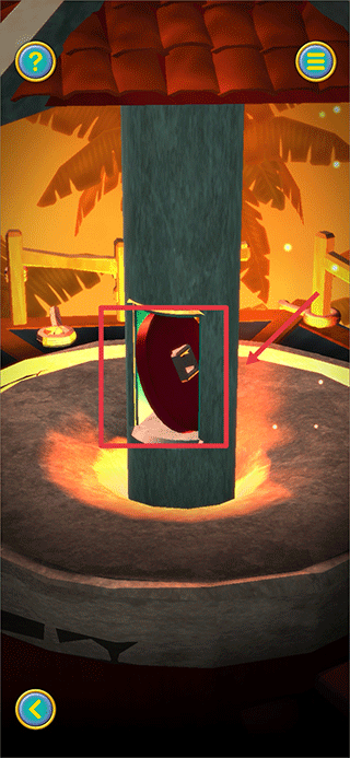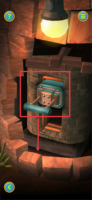 2、触发第二段教程后,先返回缩小画面,将灯塔转动到下图的角度,上方的盒子可划动打开获取【红宝石】,下方可获取【船轮】和【蓝宝石】
