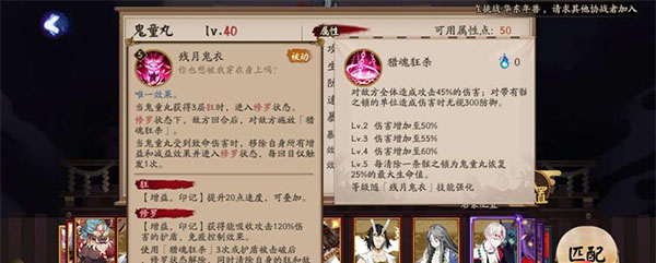被动技能:当鬼童丸获得3层狂时,进入修罗状态。修罗状态下,敌方回合后,对敌方施放「猎魂狂杀」。当鬼童丸受到致命伤害时,移除自身所有增益和减益效果并进入修罗状态,每回目仅触发1次。