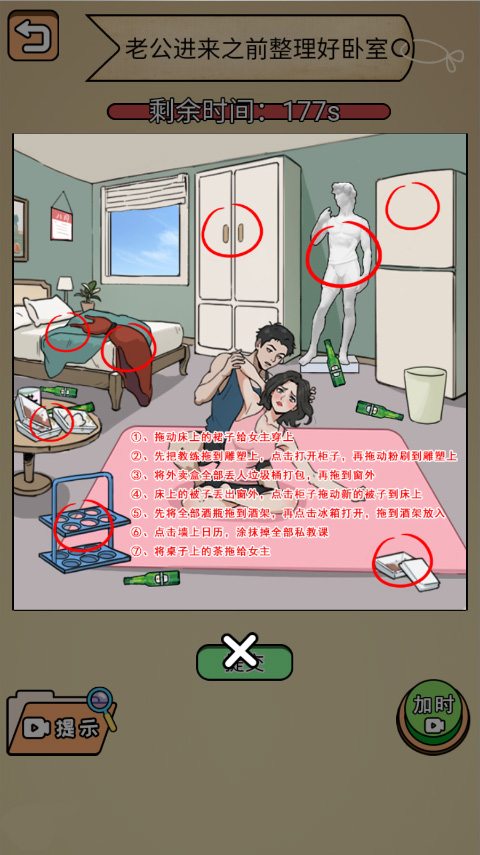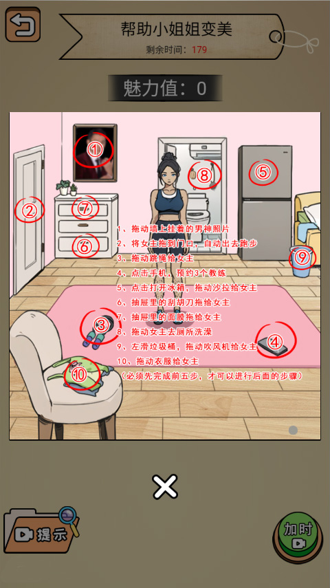 拖动床上的裙子给女生穿上,先把教练拖到雕塑上,点击打开柜子,再拖动粉刷到雕塑上,将外卖盒全部丢入垃圾桶打包拖到窗外,先将全部酒瓶拖到酒驾上,再点击冰箱打开拖到酒驾放入,点击墙上日历,涂掉全部私教课,将桌子上的茶托给女主。