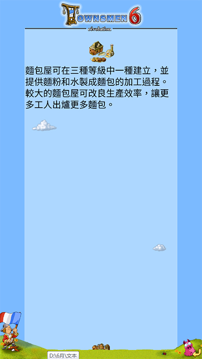 将生产建筑生产出的资源进行加工,制造出一些高级产品。需要消耗资源。加工建筑一共有三种:风车、面包房、冶炼厂。