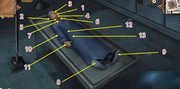 2、死者脖颈、隐藏的勒痕、死者足尖、新鞋、死者右臂、死者的手、死者衣服、死者的尸斑。