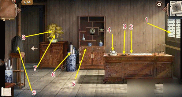2、抽屉里的图谱、倒着的木椅、横梁上的圈套、房梁、博古斋序的牌匾、木榻、地上的脚印、博古斋序的大门、一串钥匙。