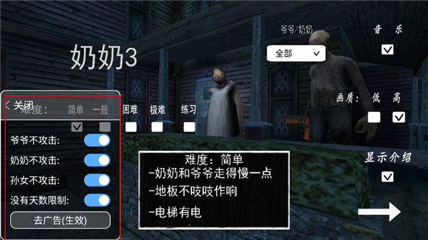 此版本已由网络大神破解完成,游戏内置修改器,玩家只需要在菜单中打开便可无敌,直接开挂,游戏中爷爷、奶奶、孙女都不会打你,没有天数的限制,同时游戏中也不含任何广告,给玩家带来非常好的体验感!