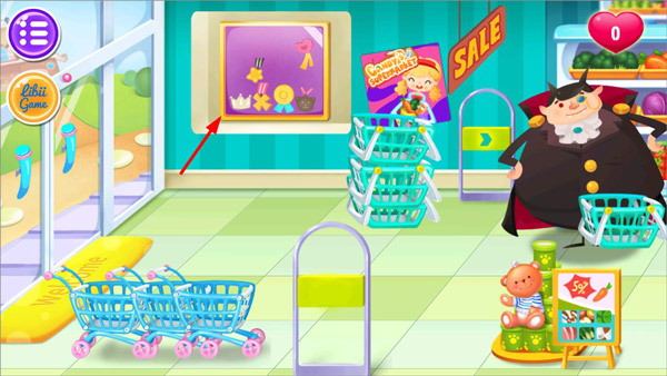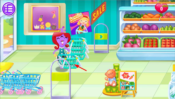 1、打开游戏,欢迎光临糖糖的超市,看看来的顾客,首先给他们一个购物工具,然后就可以开始陪他们逛街了;