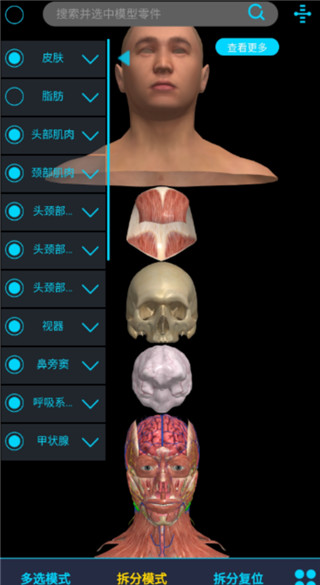 【多选模式】点击开启多选模式,点选模型可同时选中多个部分的模型 。【拆分模式】点击开启拆分模式,可将选中模型部分拖动单独分离出来进行观察。