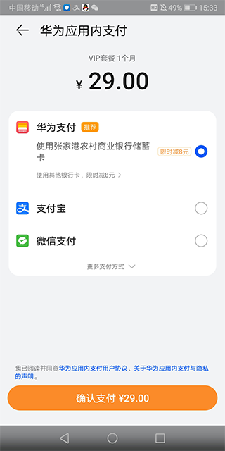 没有激活码的可以选择其中的一个会员套餐进行支付付款即可,付款时优先使用华为钱包