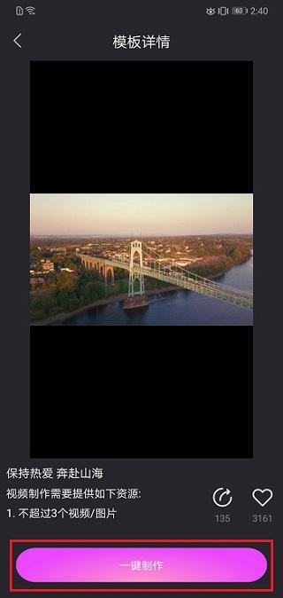 在一键视频软件中选到适合的模板之后,进入模板视频后,我们可以在对应的模板页面中看到支持上传的视频或图片的数量,点击“一键制作”后会跳转到手机相册中,在支持的数量以内上传素材即可。