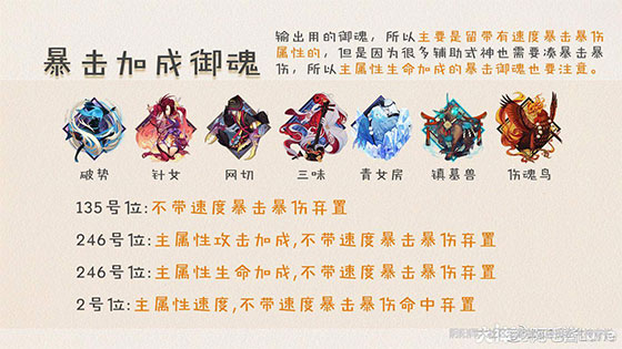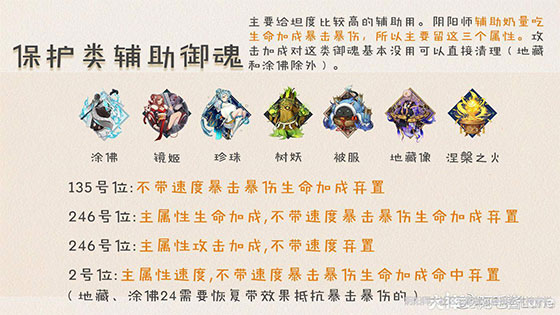 辅助类御魂主要看功效而不是御魂自身的加成!所以要按照功效分类别来整理哦。这类御魂主要给坦度比较高的辅助用。阴阳师辅助奶量吃生命加成暴击暴伤,所以主要留这三个属性。攻击加成对这类御魂基本没用可以直接清理(地藏和涂佛除外,需要在整理完后另外恢复。)