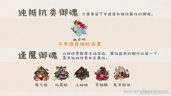 已经到辅助类御魂的最后一类啦,纯抵抗类御魂整理思路很简单,建议留下带速度和抵抗的就好!逢魔御魂最好是手动整理~因为对萌新来说获取难度太大所以只要属性能用就建议留下,差的属性尽量用四件套补足。