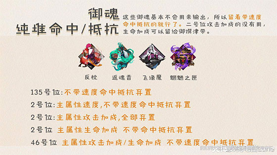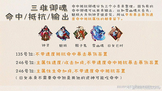 命中抵抗御魂分为三个小类来整理,因为有的命中御魂可以用来输出,比如雪幽魂大岳丸,魅妖大天狗钟灵彼岸花,所以带有暴击暴伤速度命中抵抗属性的都要留下。日女需要注意一下,他本身是不吃命中的,但是使用他的式神可能技能本身需要命中,所以也尽可能留一下。