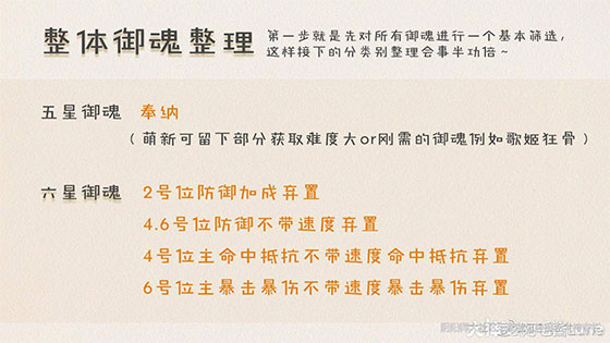 1、整体御魂整理整理思路是从整体到局部,so第一步就是先对所有御魂进行一个基本筛选,这样接下的分类别整理会事半功倍~防御加成如果不能加速度收益不大,命中抵抗暴击暴伤等对附属性要求很高的御魂也可以先整理!