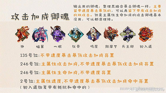 大部分都是输出用的御魂,整理思路和暴击御魂一样,主要留带速度暴击暴伤的,可以再留下带有攻击加成的双攻击。但是主属性生命加成的攻击御魂基本没用,可以都清理掉。