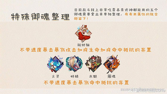 目前在斗技上非常吃香各类式神都能用的五个御魂!而且获取难度都比较大,所以需要拿出来单独整理,有有用属性的就全部留下!尤其是招财猫,以下会把需要留下的属性一一列举。