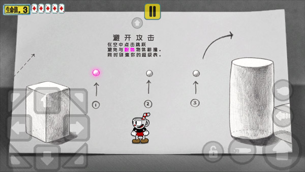 你可以在地图一开始的小屋里体验这个新手教程,除了一开始在地图界面上有显示方向键的虚拟键盘,在打boss的时候,都是隐藏的,所以你要记住除了方向键以外的其他键位的位置: