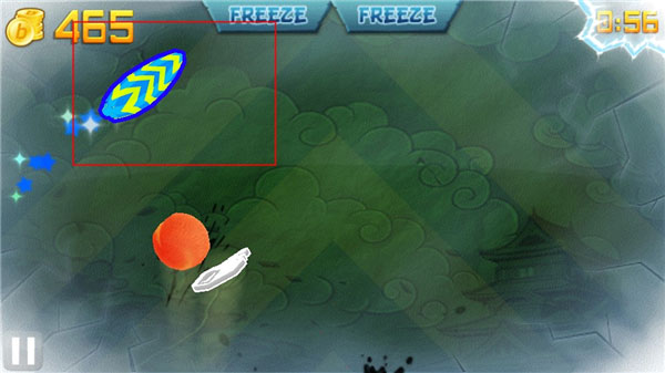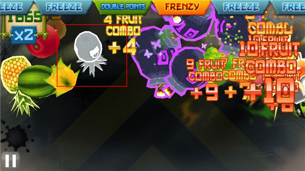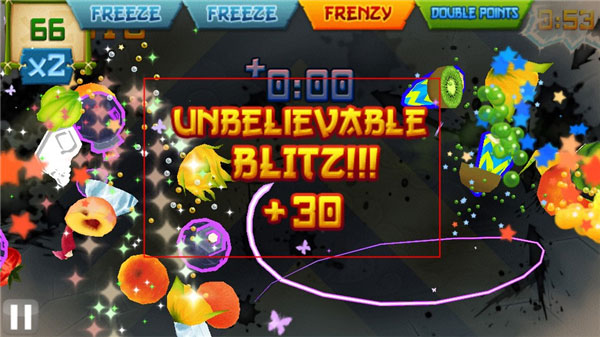 (同时得到狂热效果(Frenzy)和冰冻效果(Freeze),大量水果在画面上缓慢移动ing)