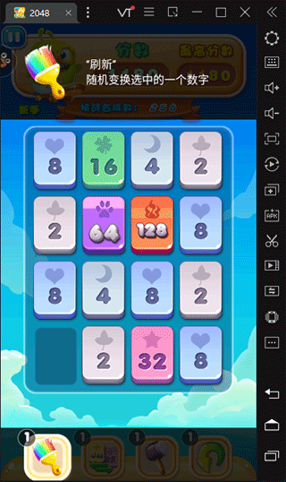 4、刷新:随机变换选中的一个数字,有可能是2/4/8/16/32都有可能。