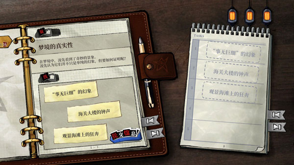 在故事推进中,通过对话、电视节目、论坛信息等各种途径都可以获取情报与疑点,各种情报会构成解决事件的关键线索