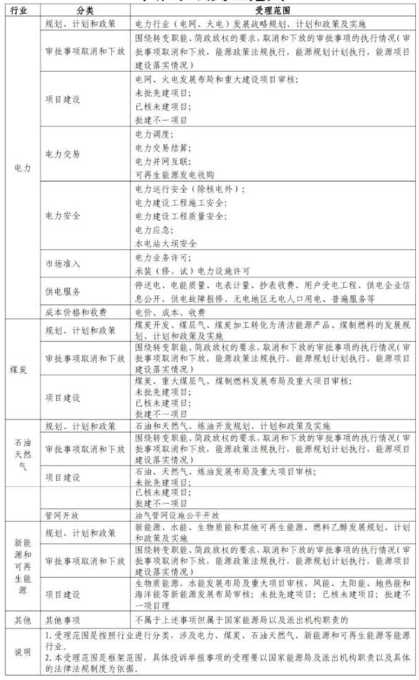 国家能源局12398能源监管热线投诉举报事项受理范围