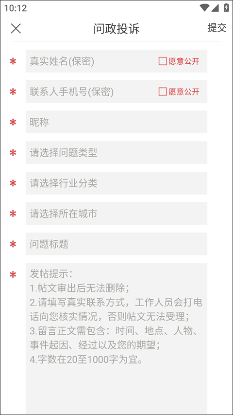 1、打开应用,在投诉建言中填写好的你的信息后选择并点击右上角的“提交”的选项;