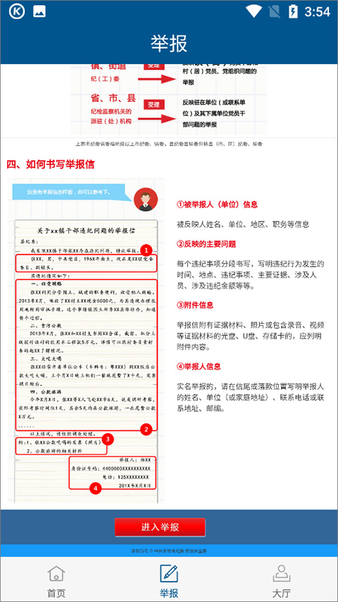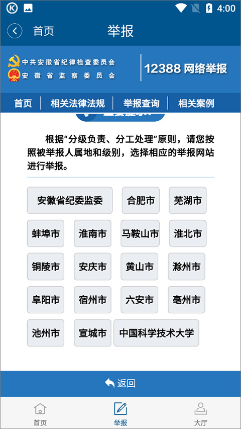 1、打开安徽纪检监察app,通过点击底部导航栏中的【举报】(下图绿色箭头所指)进入【举报】页面