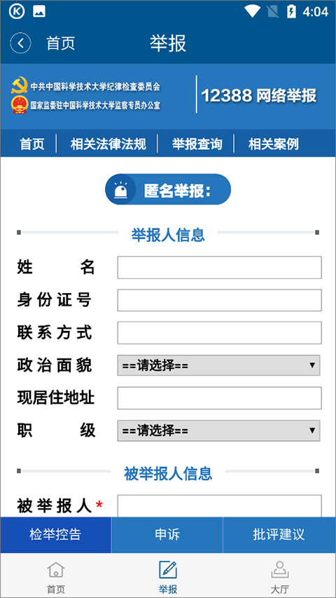 5、接着用户可以看到中国科学技术大学纪委(国家监委驻中国科学技术大学监察专员办公室)官方举报渠道,在这里举报人填写被举报人和举报人等相关信息提交即可。