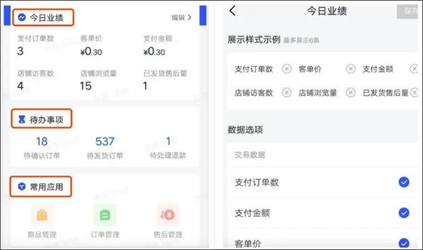 2、在“首页页面”上可以查看“今日业绩”、“待办事项”、“常用应用”三个板块。其中,“今日业绩”具体涵盖支付数据、售后数据、店铺数据、财务数据,又可细分为“支付订单数”、“支付金额”、“店铺访客数”、“已发货售后量”等细分的数据指标,商家还可以根据个人需求对显示的数据字段进行调整。