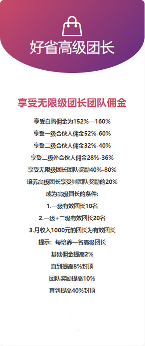 ②团长的一级收益是合伙人的3倍,二级收益是合伙人的6倍,而且还有无限级收益和培养团长收益