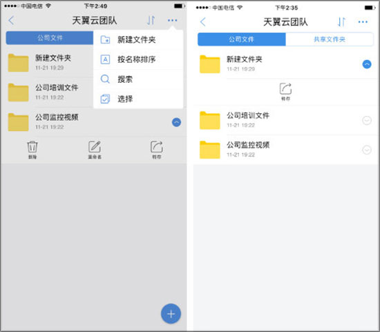 通过天翼企业云盘app,可以实现管理员上传管理公司文件,普通员工查阅接收公司文件;所有员工可创建共享文件夹,添加内部员工共享,通过设置不同角色,限制文件访问权限;超级管理员具有后台管理权限,可进行成员管理、空间管理、套餐订购等功能,是企业用户最好的存储解决方案之一。