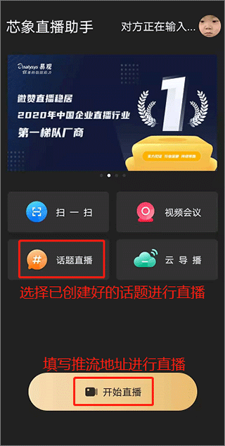 2、成功登录账号后,点击【开始直播】填写推流地址进行开播,或点击【话题直播】下的话题进行开播;