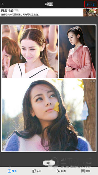 3、在“模板”界面选择自己需要的模板后,调整图片的在模板中相应的位置后,点击界面右上角的“下一步”;