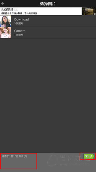 2、在“选择图片”界面中,选择要进行拼图的图片(1~10张)之后,点击界面右下角的“下一步”;