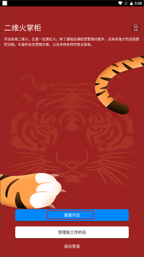 1、进入到app后,会显示两个功能选项:我要开店、管理我工作的店,选择第一个;