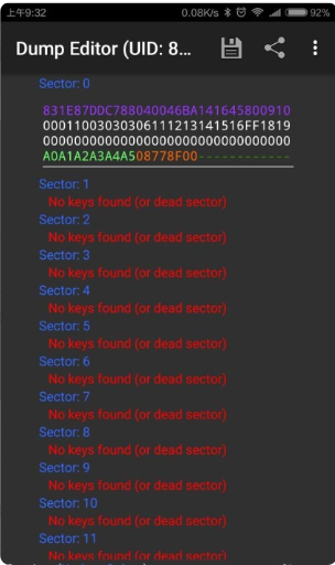 4、如下图,读出的数据中,除了selector0的第一行外,其他地方还有数据,或者直接显示NOKEYSFOUND,那你们门禁被模拟的可能性就比较小;如果selector0的第一行都没法读出来,或者卡片不被手机识别,这种门禁卡就不能用手机模拟