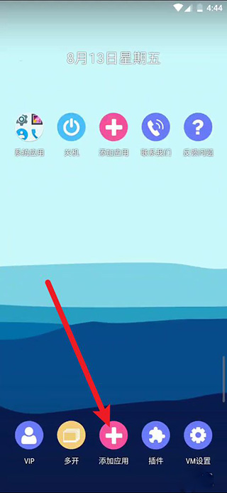 1、在手机上运行51虚拟机手机版;2、点击下方的【添加应用】;